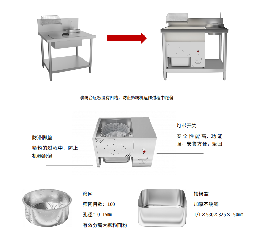 Home / 裹粉台 / 筛粉机 筛粉速度快:150秒完成操作,面粉回收率高达60% 设计与市场上裹粉台匹配,杜绝面粉到处飞的问题 采用加厚不锈钢板设计,经过高效处理,耐腐蚀 模块化设计:按需求加装筛粉机;随时添加,随时使用 专利:振动筛粉机取得实用新型的专利 Category: 裹粉台 Tag: 裹粉 Description Description 产品型号 外形尺寸(mm) 电气参数 BSF01-K 615 × 550 × 420 220V,150W Related products 裹粉台 Read more